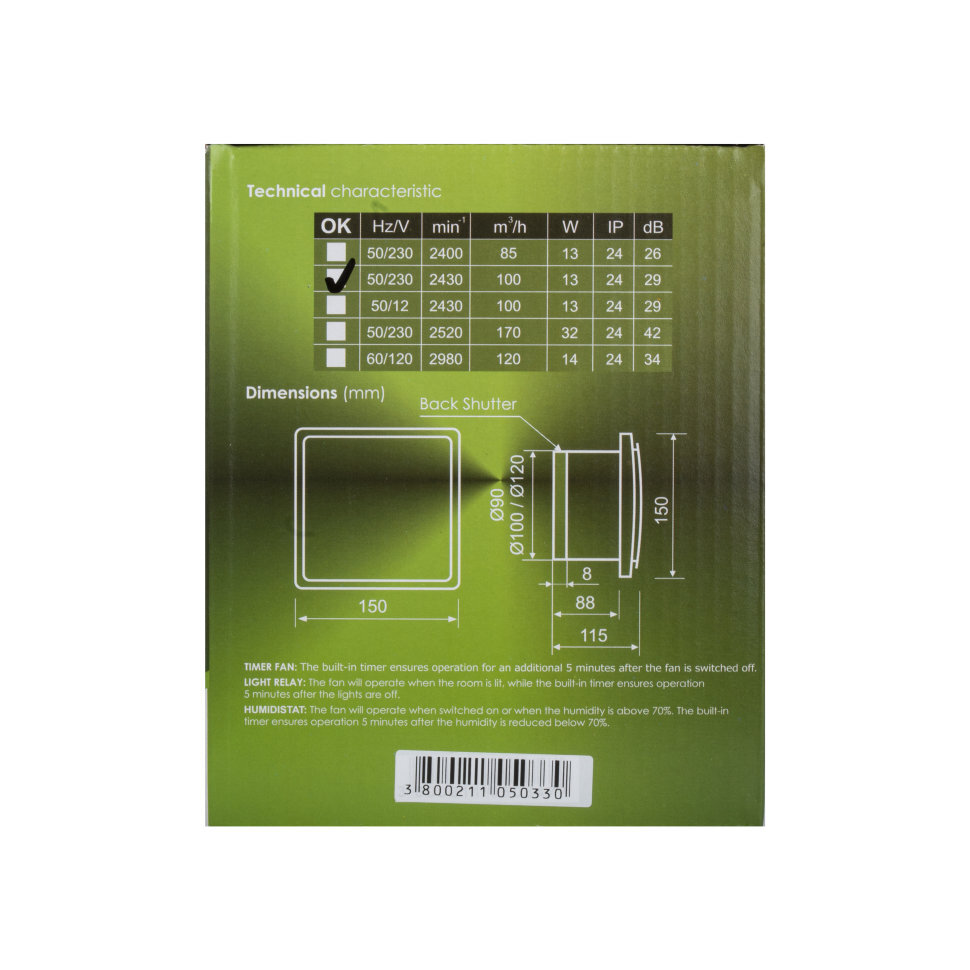 ХарактеристикиТолщина, мм83 ммУровень шума, дб29Напряжение питания, В220Класс защиты24Максимальная рабочая температура+60 СОбратный клапанДаВлагозащищенный корпусДаУстановочный диаметр100 ммВоздухообмен, м3/час100Мощность, Вт13 ВтПроизводительMmotorsТипнакладнойРабочий механизмосевойСтрана прозводительБолгария